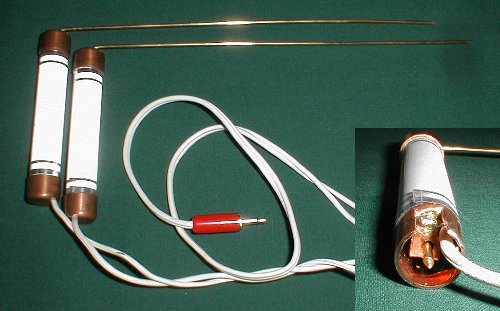 The other belt-mount unit is called a "Magnetic Wave Guide Receiver". Like the AQC, it has a 1/8" headphone jack that the rods plug into; it also has a momentary push-button switch and an LED. When you push the switch, the LED turns on. The inside of the Magnetic Wave Guide Receiver is shown in Fig. 9. Besides lighting the LED, the only thing the switch does is short the dowsing rods together. If you touch the dowsing rods together, the LED also turns on. I'm not sure why the user of the VR-800 needs a battery powered box to short the rods together, or why he would need an LED to tell him that the rods are shorted. A final interesting feature of this unit is the bar magnet that is glued inside the box. It is not connected to anything, or seemingly used for anything, just sitting there. There are no advertising claims I've been able to find on this accessory, so I cannot comment on what it's supposed to do, other than to say it doesn't do much. The remaining pieces of the VR-800 are the ground probes and the dowsing rods, as well as a carrying case. The ground probes are shown in Fig. 10, along with one disassembled. They are made of common PVC pipe fittings and 1/4 brass rods. It is obvious that the quality of construction is extremely poor and can easily be exceeded by any reasonably competent handyman. The dowsing rods are shown in Fig. 11 with an inset showing details of the inside of the handle; these are made from common copper pipe and fittings, plus 1/4" brass rods. Again, poor quality is evident and better rods can easily be made for very little money. |