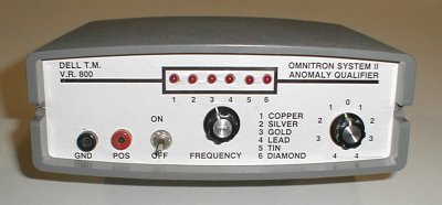 The 555 pulse output is connected to one of the output jacks through a decoupling capacitor, with the other jack connected to the circuit ground. The decoupling cap has the effect of blocking DC while still allowing the pulse to go through. The pulse duty cycle is very large, around 95%, meaning that 95% of the time it is in a "high" state and 5% of the time it in a "low" state. Because of the decoupling capacitor and the extremely short pulse width, the output signal appears to be nearly zero most (95%) of the time, with short negative-going pulses. Thus, the RMS signal (effective signal power) delivered to the ground probes is exceedingly small, around 1 volt rms. The analysis so far has been for unloaded (open-circuit) ground probes. In operation, the ground probe wires are plugged into the panel jacks, and the probes are inserted into the ground. The probe wires are made from common zip cord, which is separated enough so that the probes can be inserted into the soil no more than 8 inches apart. Depending on moisture, the soil will resistively load the transmitter outputs. This will have two effects, one being that the decoupling capacitor will interact with the resistive load to cause severe signal decay and distortion. The second is that the 555 timer chip alone is not designed to drive much of anything, and the output pulse is further degraded by the chip's inability to drive the ground resistance (there is no drive amplifier in the VR-800). Dell Systems claims the VR-800 utilizes "Harmonic Induction Technology" (HID), and the advertising claims that frequency selection is "micro processor" controlled and can be "reprogrammed" for other elements. In fact, the manual for the "Weight Chek" accessory (described below) says of the HID concept: "This [Harmonic Induction Discrimination technology] was an extremely light "Micro Processor" with only three basic components, a computer chip, a timer, and a selector and the secret of being able to program the chip with the timed, synchronized transmission of frequencies of any chemical element... [It] produced three (3) timed frequencies responding to the electron, neutron and atomic weight of the element." The use of the word "Harmonic" implies that the transmitted signal contains harmonics - this is basically true, since a pulse does have significant harmonic energy. The term "Induction" implies that the transmitted signal inductively couples with the target in some manner, which gets back to the idea of signal lines as mentioned above. But the notion of generating a signal line - with the fundamental frequency and/or any of its harmonics - to a distant target is false. Even if signal lines were not pure fantasy, with only the 555 driving closely spaced ground probes through a decoupling capacitor, the delivered output power is negligible. The claim that a "micro processor" is used to control frequency selection is entirely false; there is no microprocessor or computer chip, or anything that even remotely resembles one. The claim that there are 3 timed frequencies responding to the electron, neutron and atomic weight of the element is also false. There is only one pulse waveform, therefore only one fundamental frequency, plus its mathematical harmonics, all of which have nothing to do electrons, neutrons, or atomic weight (there is no such thing as a "neutron frequency" anyway). The pulse frequency, as mentioned before, is variable over a wide range of values for any given setting of the element selector switch. Interestingly, there is quite a bit of overlap in the frequency ranges, further debasing the claims that the MFD frequencies are tuned to the resonant frequencies of certain elements. For example, on this unit the adjustment range for gold (530-817 Hz) overlaps the ranges for silver, lead, tin, and diamond. There is no way to know what frequency is being transmitted regardless of what the selector switch is set to. |