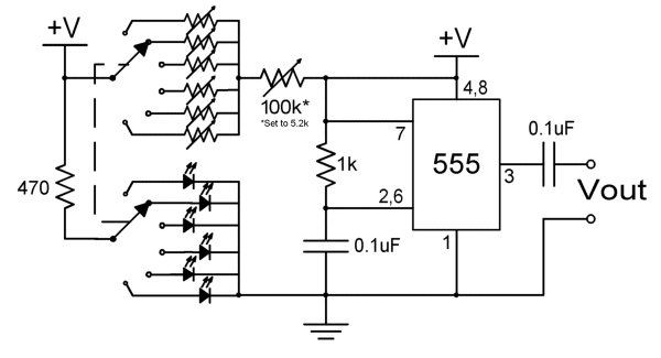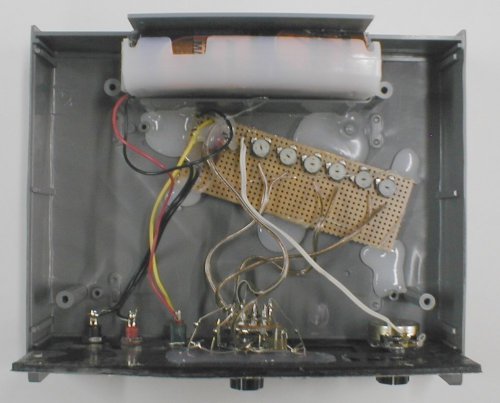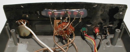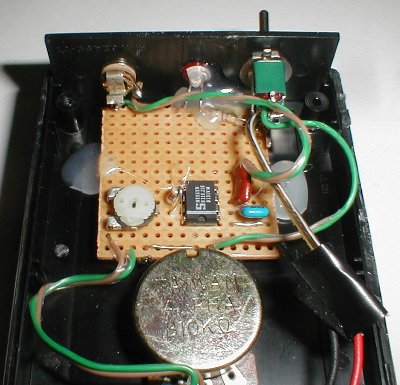 The inside of the transmit box is shown in Fig. 3, with the inside of the front panel in Fig. 4. Besides the switches and LED's on the front panel there is a hand-wired circuit board glued to the bottom half of the box, shown in Fig. 5. The circuit board used is known as "perf board", a type normally used for prototyping circuits and commonly available at Radio Shack. The circuitry is a "555" timer chip wired as a pulse oscillator with 6 trim potentiometers that set the frequency, depending on which is switched in by the front panel switch. A complete schematic is shown in Fig. 6 - the unmarked potentiometers are 100k that are adjusted to achieve the final frequencies. |